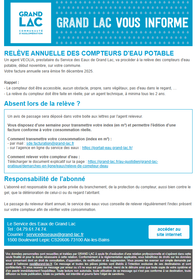 Grand Lac vous informe : Campagne de relevé des compteurs d’eau