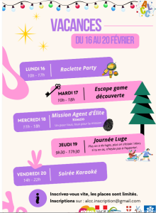 📄 Le programme détaillé est disponible auprès de l’accueil du centre social et culturel ALCC, sur Facebook, Instagram et intramuros.