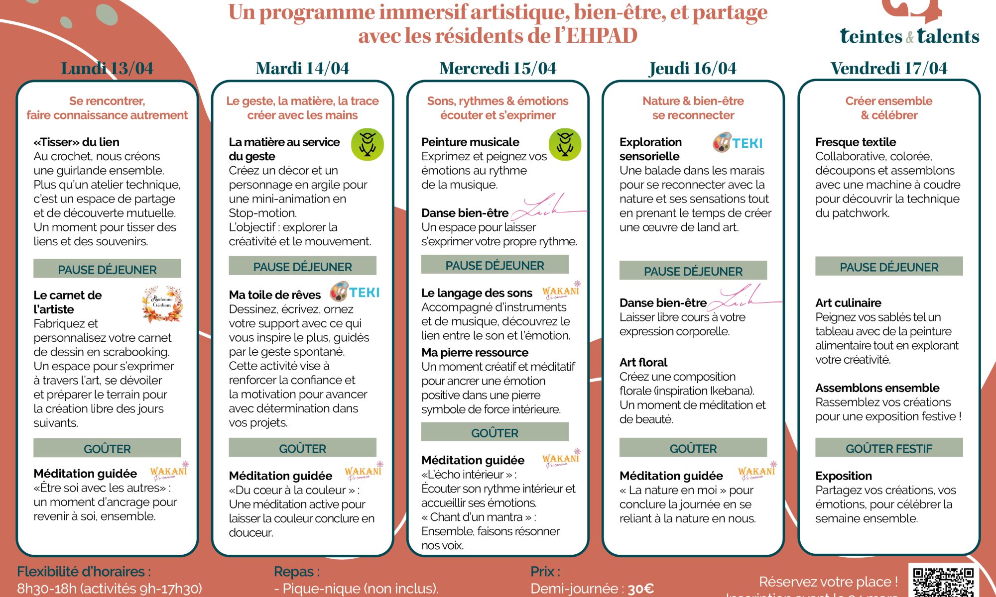 C’est l’occasion de partager des moments conviviaux et ludiques autour de thématiques artistiques et de bien-être, encadrés par des professionnels du territoire et des bénévoles de l’association Teintes & Talents.