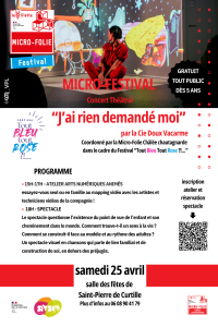 Dans le cadre du Festival Tout Bleu Tout Rose, la Micro-Folie organise un micro-festival le samedi 25 avril à la salle des fêtes de Saint-Pierre de Curtille (affiche en PJ)